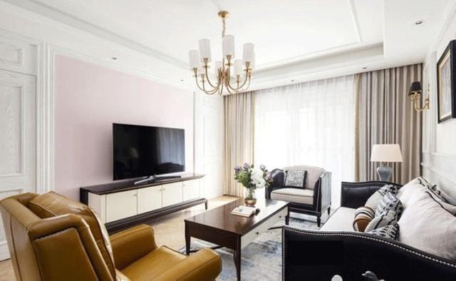 室內(nèi)電視墻刷成了粉色,與白色的石膏線和屋頂搭配,顯得清新雅致??蛷d沙發(fā)采用了組合擺放方式,容客率很贊,又提升了整體的調(diào)性!