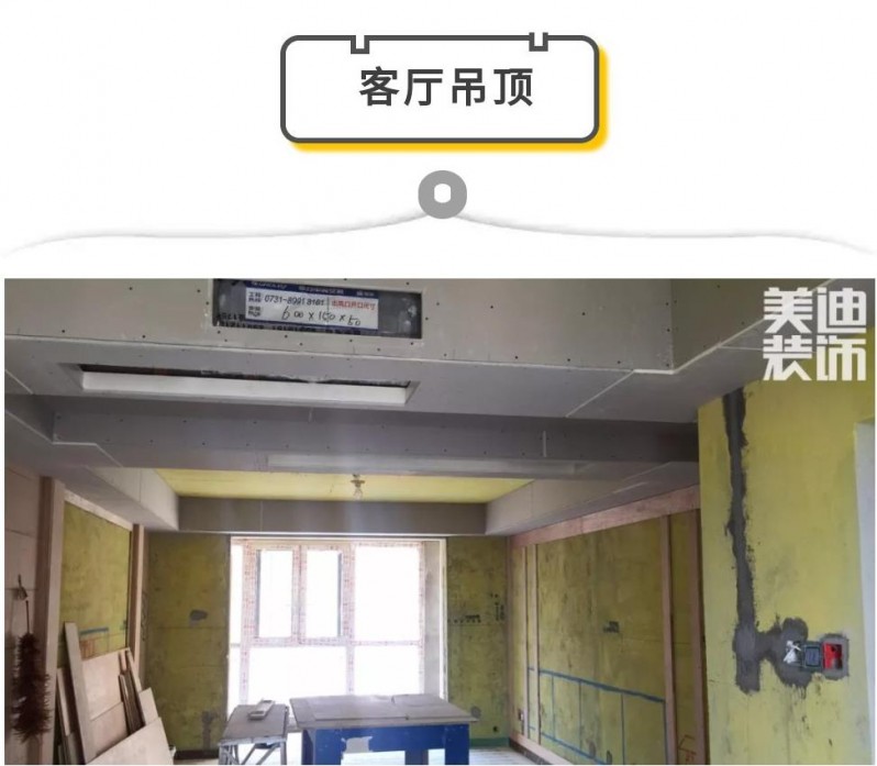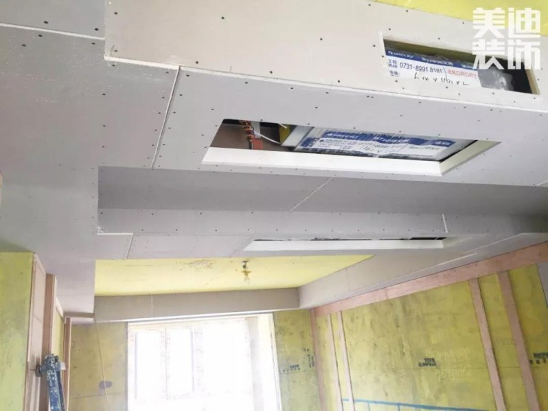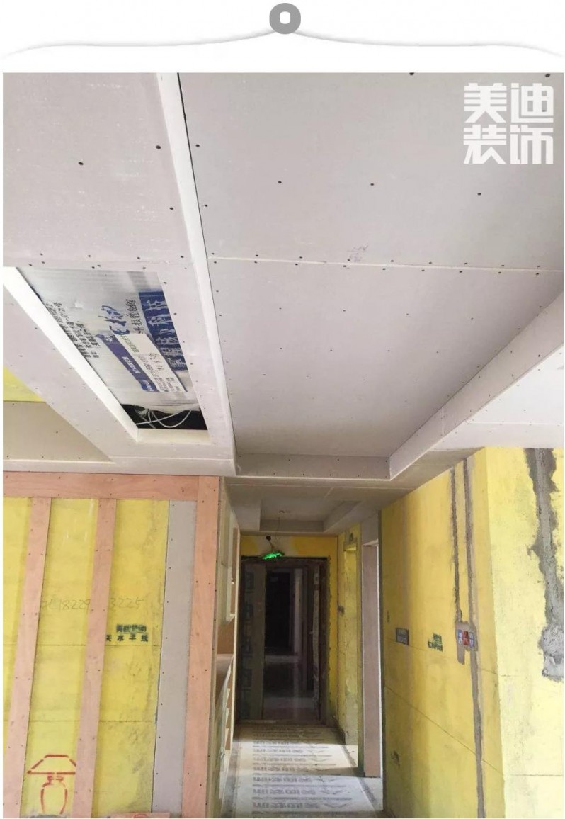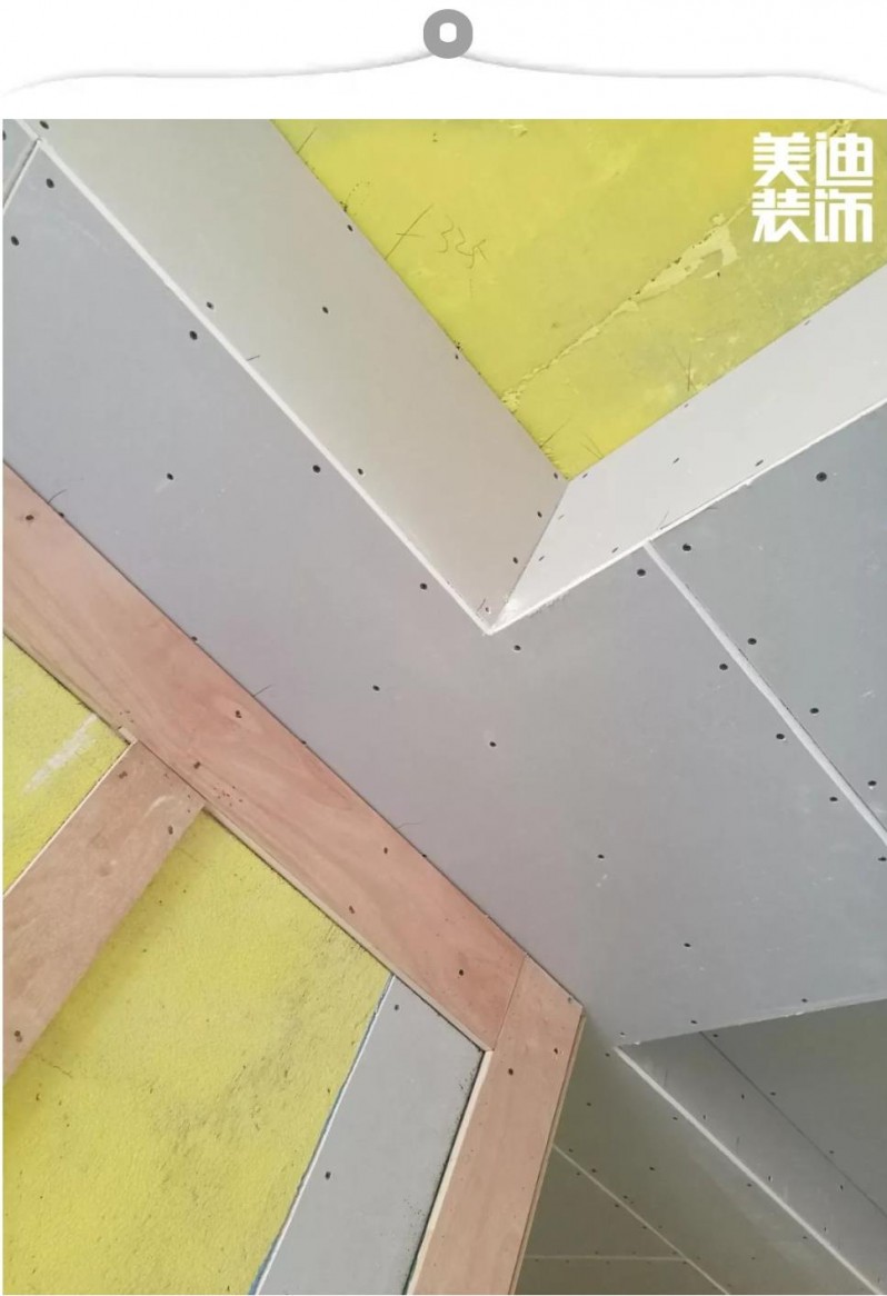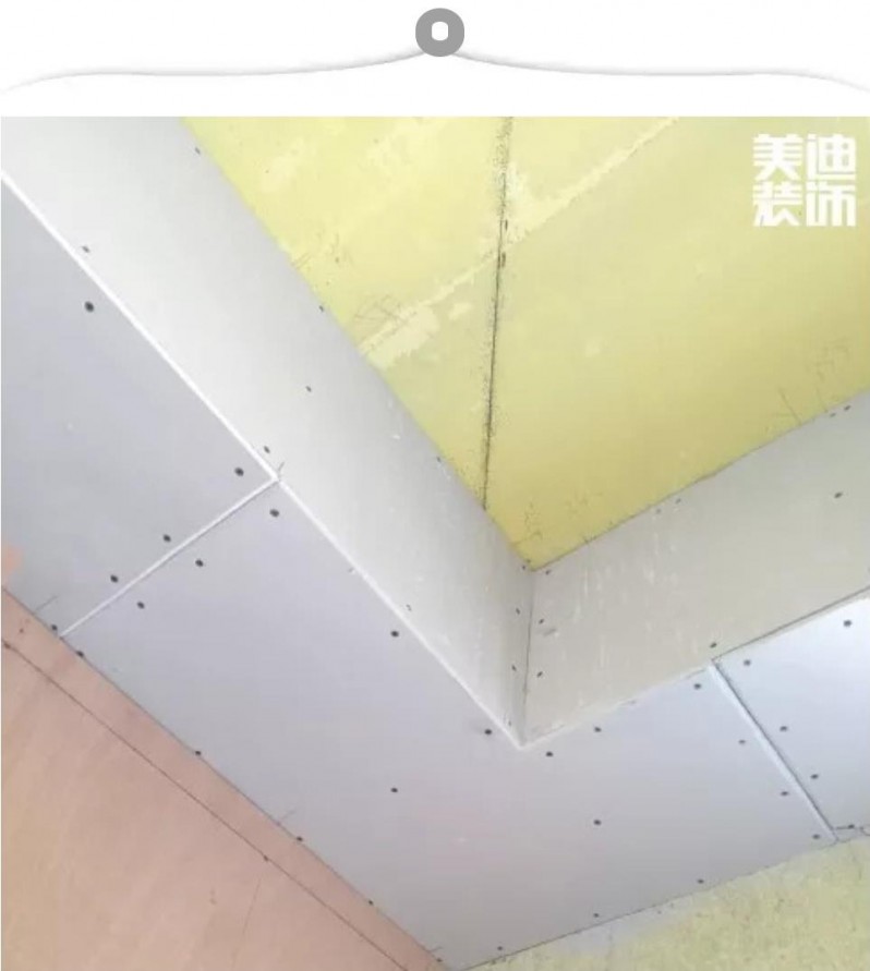 ▲ 在整個吊頂部分,吊頂轉(zhuǎn)角處最容易開裂。蘭仲凱經(jīng)理告訴小Y,現(xiàn)在美迪裝飾的工地吊頂都用“7字型”過度轉(zhuǎn)角,使用這種一體式的板塊,更有利于后期刮膩子,防止拼接不平導(dǎo)致的后期開裂。