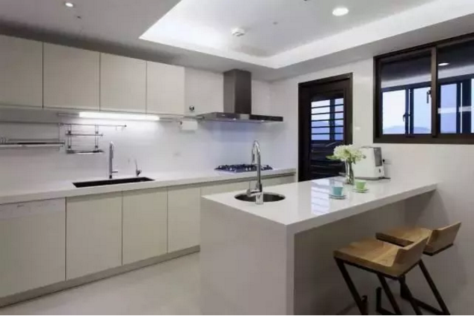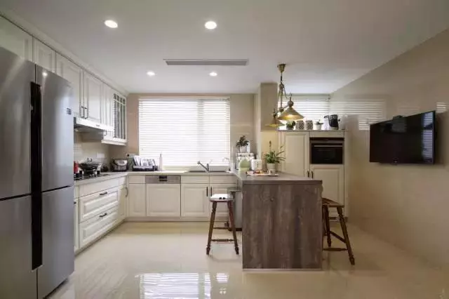 廚房中的吧臺還是一個很好的烹飪輔助操作臺,既避免了油煙問題,又解決了餐廳空間局促、采光通風不足的問題。閑暇時,可以在這里喝杯紅酒,泡杯咖啡,尤為愜意。