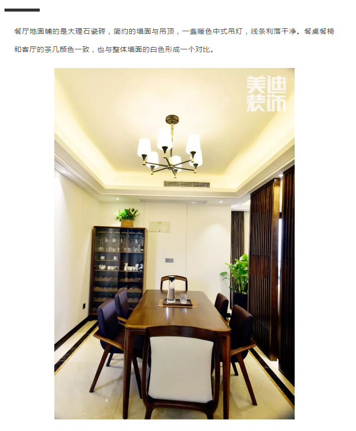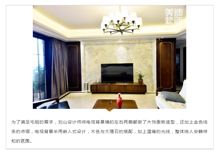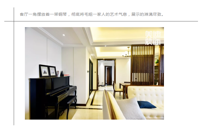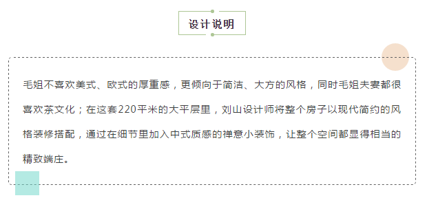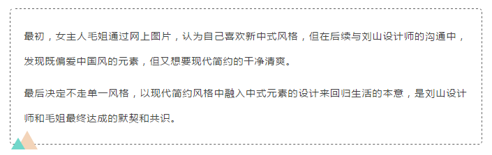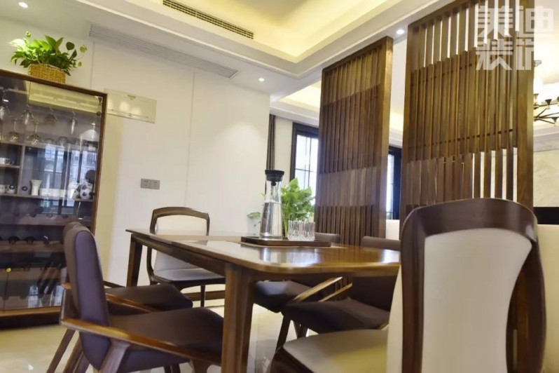 ▲結(jié)合毛姐的想法,劉山設(shè)計師還特意在客廳與餐廳之間加上兩塊木格柵,相較于傳統(tǒng)的屏風(fēng)而言,木格柵更具透氣效果,在光與影的變幻交錯間,中式禪意的韻味緩緩涌現(xiàn)。