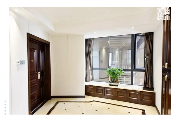▲入門的左側(cè)是嵌入式玄關(guān)柜,它兼具鞋柜功能;古茶色的玄關(guān)柜,一個兼有中式風(fēng)格和簡約風(fēng)格的設(shè)計,不會有中式的沉悶,也不會有簡約的那種飄逸,擴大了空間的視覺范圍。