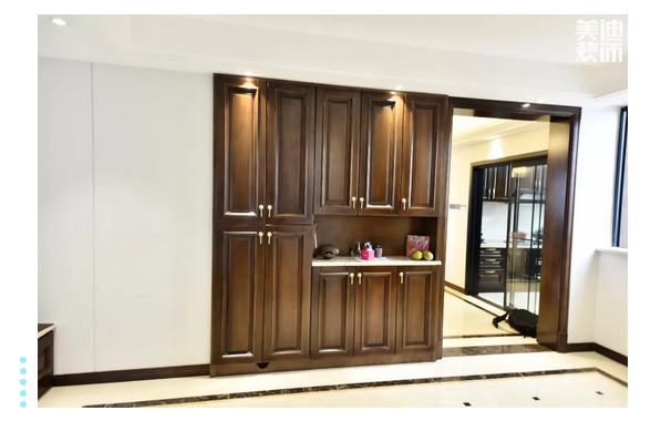 ▲毛姐夫妻倆十分喜歡紅酒和茶,劉山設(shè)計師特意在餐桌旁設(shè)計了小型酒柜,最上面一層放置紅酒杯,中間一層放置茶具,最下面放紅酒;井然有序的排列,可以很明顯地看出毛姐一家人是很熱愛生活并會享受生活的。