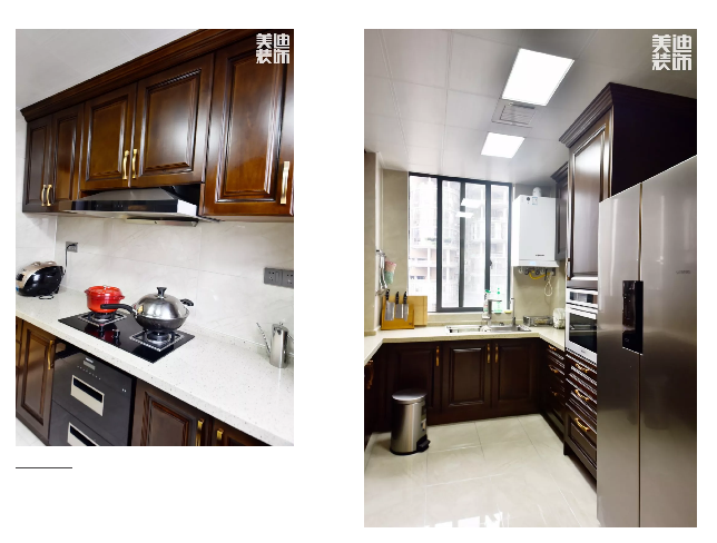 ▲ 毛姐對廚房的要求就是干凈整潔,易于打掃,因此墻面和地面都用了同色系的大理石瓷磚,櫥柜則用了造型極簡的偏中式,這樣就讓廚房顯得干練、整潔,又充滿現(xiàn)代氣息。