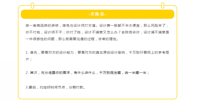 在裝修前,設(shè)計師與你的每一次溝通,都是為了能夠站在你的角度上去設(shè)計這個房子,在房子里烙上你的痕跡,也唯有這樣,才能打造出只屬于自己的家。如果你請了設(shè)計師,參考老陳的建議與設(shè)計師有效溝通。要是看完視頻還存在疑問,請你接著往下看!