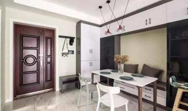 餐廳就設(shè)置在玄關(guān)旁邊,這里采用了卡座的設(shè)計,充當(dāng)了傳統(tǒng)的餐椅,可以容納更多人,還具有一定的儲物空間??繅υO(shè)置了玄關(guān)柜,并在頂部設(shè)置了吊柜以及置物架,充分解決了物品的收納問題,非常實(shí)用。