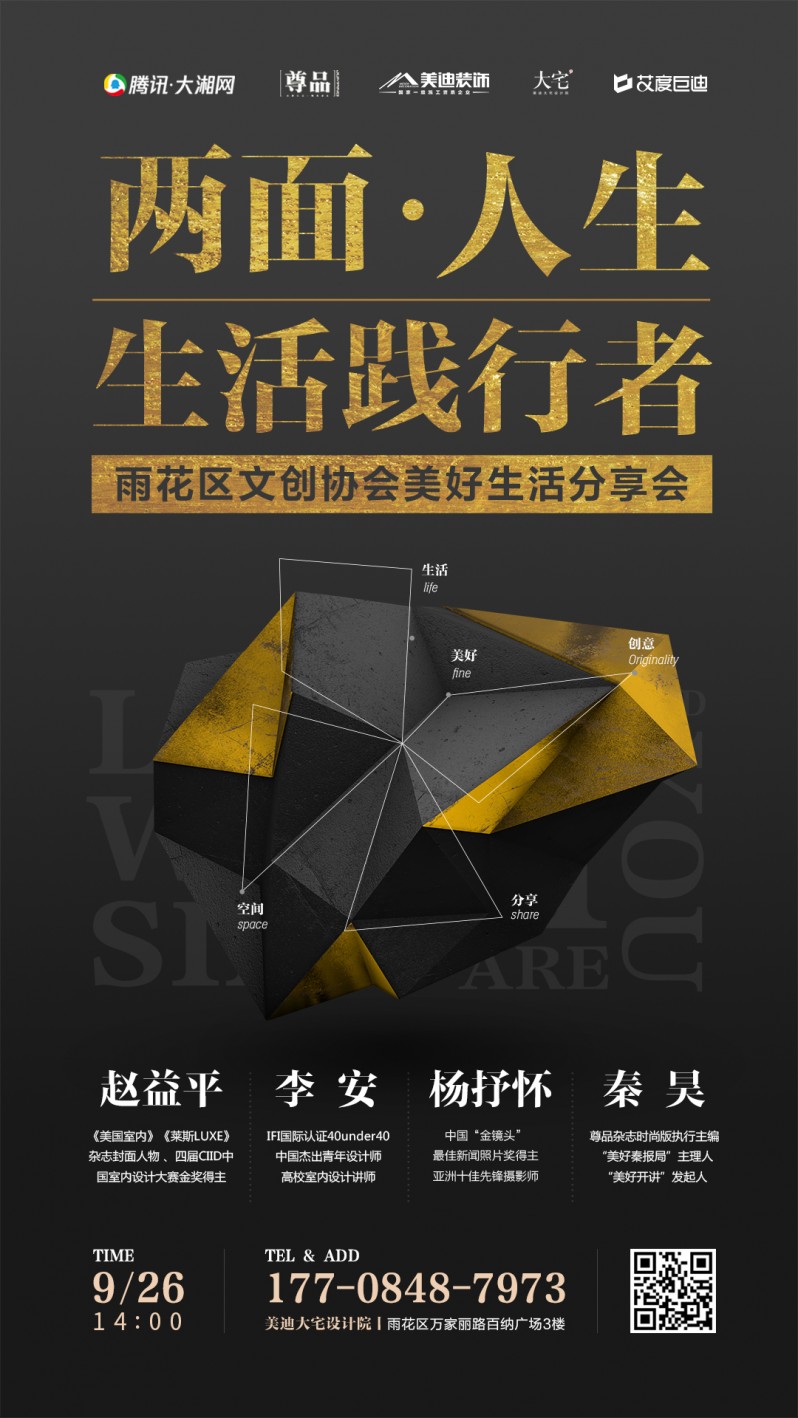 9月26日美迪裝飾&雨花區(qū)文創(chuàng)協(xié)會(huì)“兩面人生·生活踐行者”分享會(huì)活動(dòng)與大家見面。這次分享會(huì)活動(dòng)將特別邀請(qǐng)到《美國室內(nèi)》《萊斯LUXE》雜志封面人物/中國最具權(quán)威室內(nèi)設(shè)計(jì)大賽金獎(jiǎng)得主趙益平老師、IFI國際認(rèn)證40under40中國杰出青年設(shè)計(jì)師/HIID湖南省建筑室內(nèi)設(shè)計(jì)學(xué)會(huì)常務(wù)理事李安老師,以及亞洲十佳先鋒攝影師楊抒懷老師作為主講嘉賓出席。三位老師將從不同的角度,探索美好生活的真正模樣,以開拓視野和思維激蕩啟發(fā)您對(duì)美好生活的另一種思考,期待您的參加!