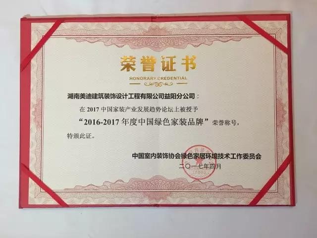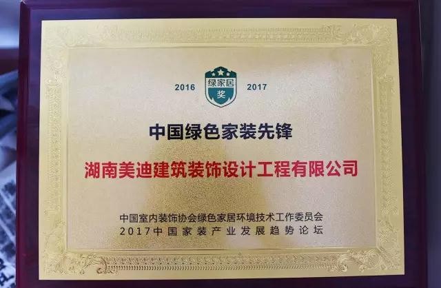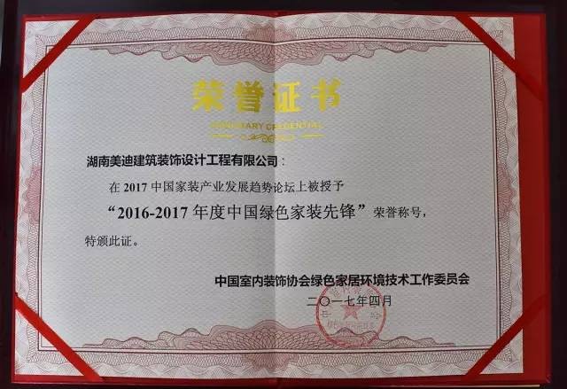 美迪裝飾“2016—2017年度中國綠色家裝先鋒”稱號