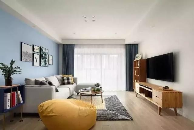 客廳,背景墻分辨選擇的清新淺藍色調和大白墻,加上良好的室內采光,行程強烈對比,整個空間顯得干凈亮堂。