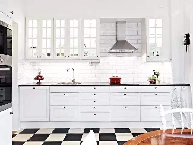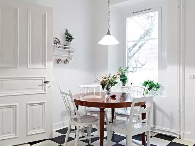 廚房的白色大門簡潔明亮,推門而入踩著黑白格子的地板,白色椅子圍繞深色實木圓桌,避開完全的純白,體現(xiàn)強烈的對比度。