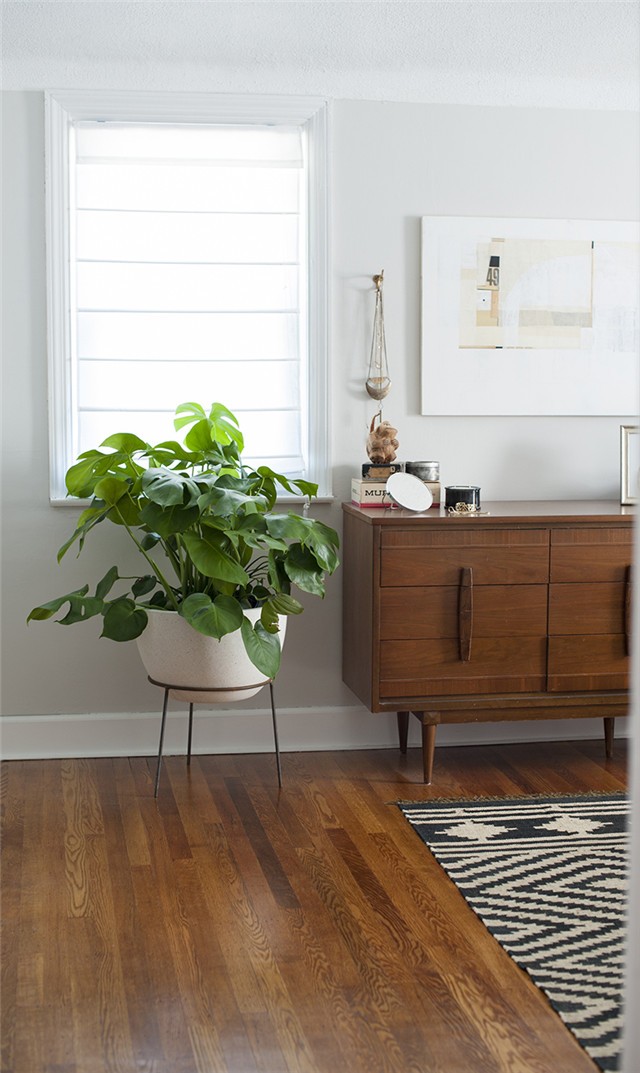 本身綠植與木質都富有極強的自然氣息,因此一盆綠植搭配在木質柜子旁邊尤為和諧。