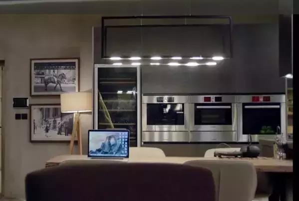 廚房里的一整套櫥柜非常高大上,金屬質(zhì)感搭配水泥墻面背景,有種美式工業(yè)風(fēng)格的味道。