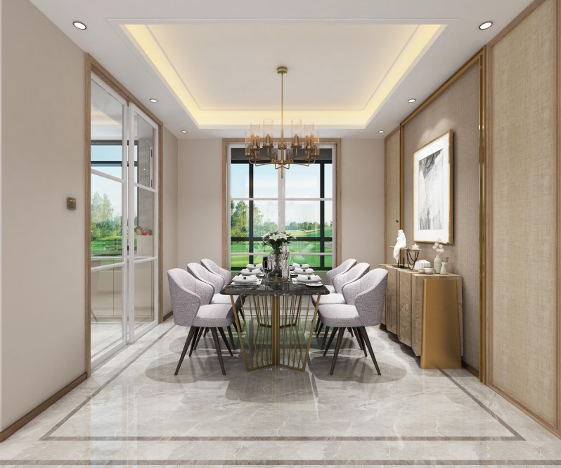 餐廳選用禪意的現(xiàn)代風(fēng)餐桌椅,同時靠墻裝了個入墻式的餐邊柜,整個空間簡潔而又舒適高檔;