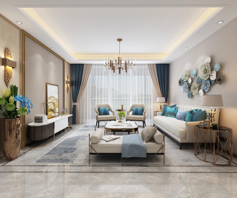 客廳的裝飾主要采用美式效果的為基調(diào),地板主要采用灰色瓷磚,和地毯的部分相呼應(yīng),增加了業(yè)主的品味和檔次。整體以米色和藍(lán)色為主,溫暖而不失冷冽!