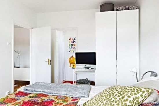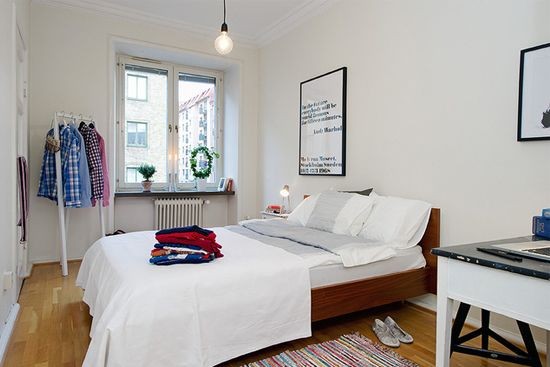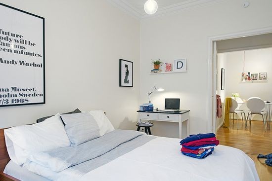 白色的墻,書桌,床單,添了些裝飾畫,跟綠植,色彩也活躍起來。