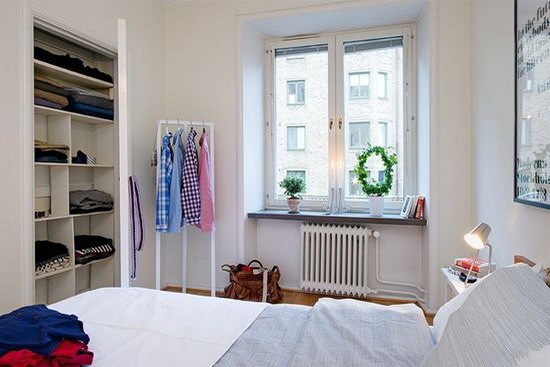 打開白色的衣柜,可看到衣服整整齊齊的疊放在那。角落里,白色的掛架上掛著幾件衣服,地下隨意著放著女式包。