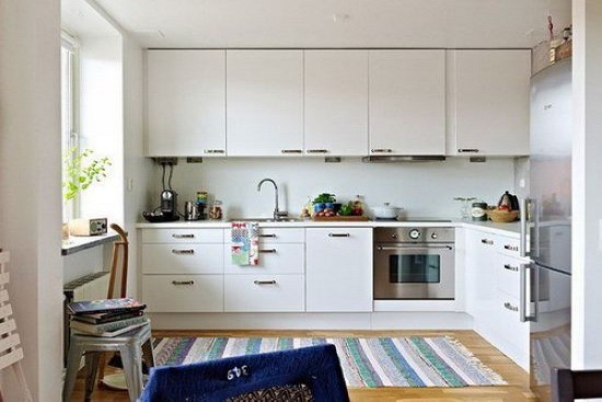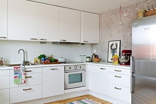 走進(jìn)廚房,感覺很干凈潔白,木質(zhì)地板上鋪了條紋地毯,旁邊立著銀白色的大冰箱。