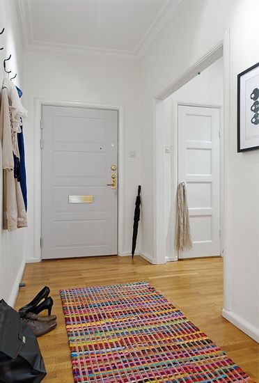 玄關(guān),木地板上鋪了五彩格子地毯,玄關(guān)處沒鞋柜,而是把鞋子隨意的放在地板上。