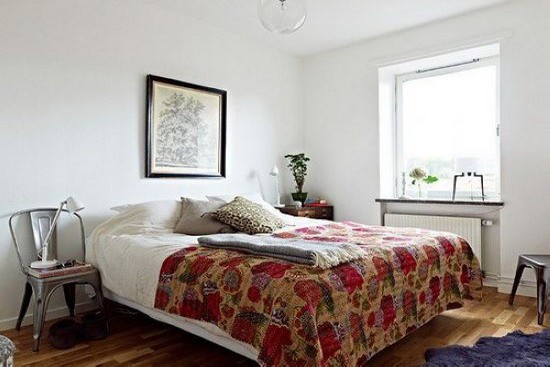 臥室寬敞,明亮。床頭邊擺了把椅子,椅子放了盞臺(tái)燈,相當(dāng)床頭柜來用了。
