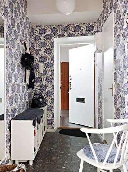 玄關(guān)的背景墻紙加上單椅子的坐毯,和黑色的包包,很搭配的。