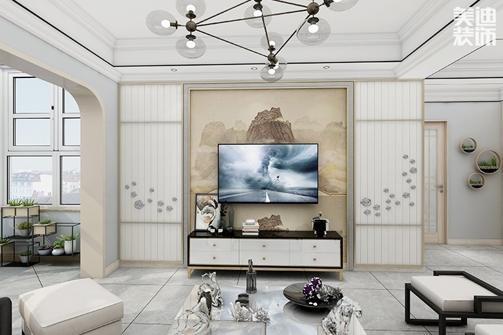 5、在裝修電視墻時(shí)應(yīng)與室內(nèi)的空間風(fēng)格契合,應(yīng)注意搭配美學(xué),再色調(diào)、畫面、意境和擺件裝飾的搭配上要相互映襯、烘托,再結(jié)合燈光的效果,就能完美的呈現(xiàn)新中式風(fēng)格的古典情致。