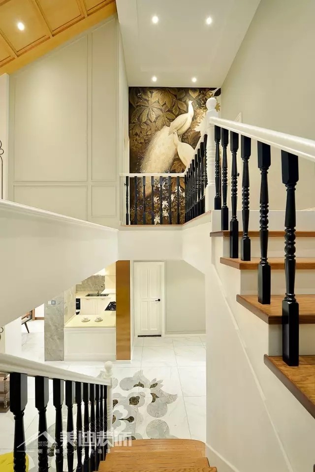 ?二樓走廊落地滿墻的手繪孔雀壁畫,是屋主空間文化的體現(xiàn)。整個設計以及最后呈現(xiàn)的效果就能讀出屋主的個性和品味,既精致又時尚。