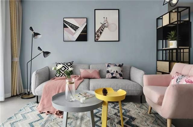 客廳是淺藍(lán)色的背景,裝飾畫一大一小,幾何圖案和長頸鹿的邂逅妙趣橫生,全局灰藍(lán)色作為打底,襯托出淡山茱萸粉的甜美,加上黃色的點(diǎn)綴,多了一份清新的氣息。
