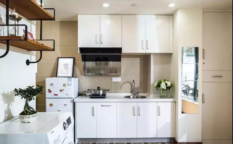 如果廚房屬于面積狹小的狹長型,建議使用一字型布局??梢栽诮锹淞舫鲆粋€冰箱的尺寸,將冰箱和櫥柜融合。擔(dān)心收納性能較弱的話,可以多做墻柜哦。