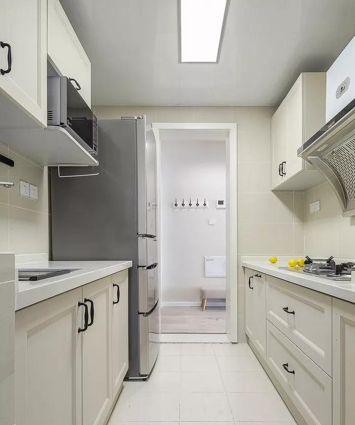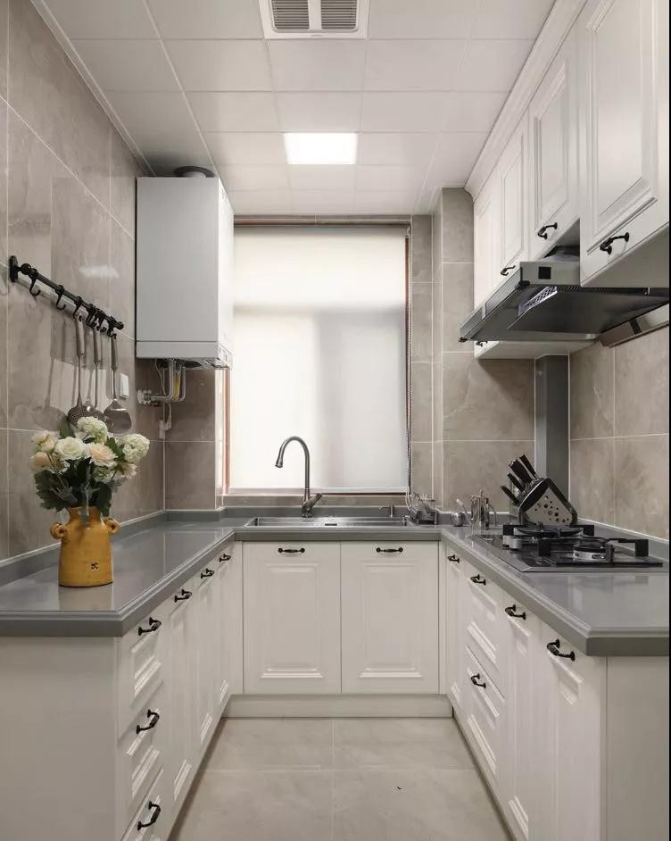 廚房門開在廚房中間的話,建議這種過道型廚房可以設(shè)計成二字型布局。如果廚房比較大,也可以將島臺和墻面平行擺放,這樣布局同樣合理,并且空間利用率極高,廚房這樣裝,好看又實用。