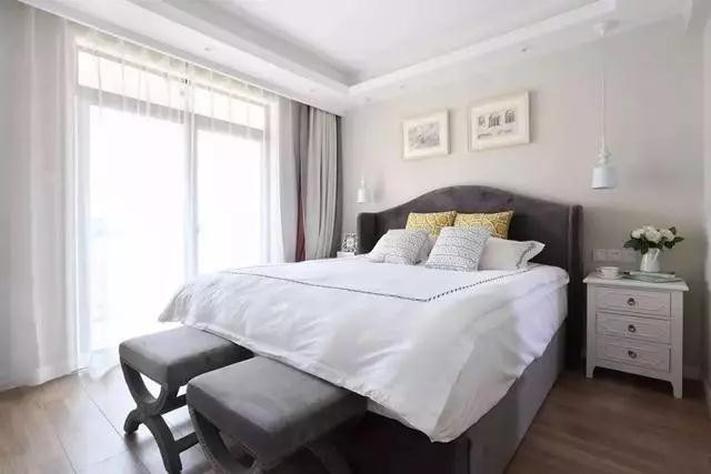 臥室以灰白素雅為主,略顯沉穩(wěn)。床頭兩個造型獨特的吊燈,增添了臥室的美感。
