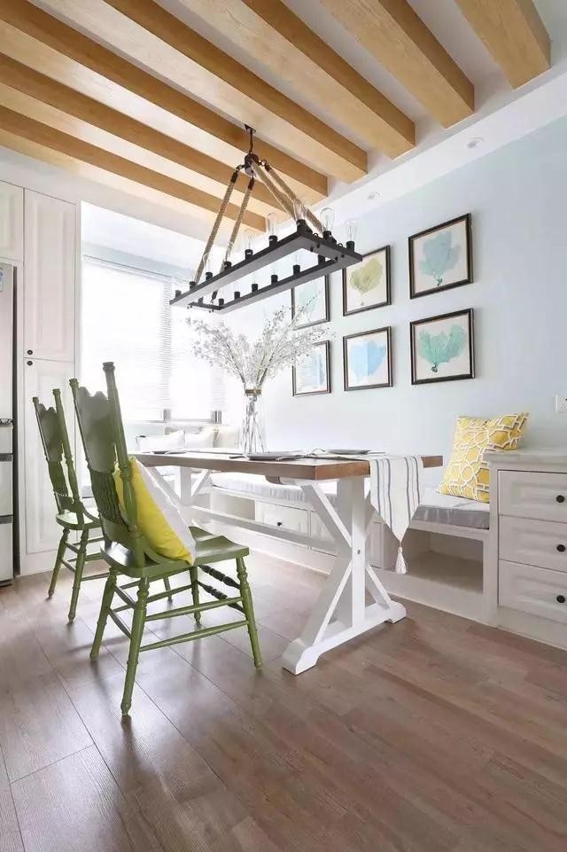 餐廳卡座式的設(shè)計搭配實木的餐桌,綠色的椅子為空間增添了清新感,假梁式的原木吊頂,吊燈和漂亮的插畫營造了浪漫的餐廳氣氛。