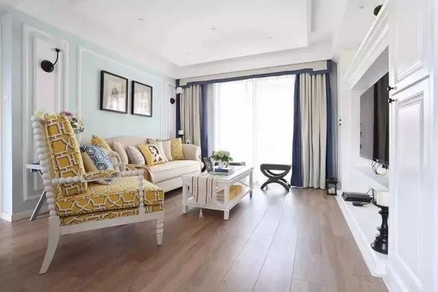 客廳電視墻利用組合式的儲物柜設(shè)計,實用性很強。沙發(fā)背景墻利用淺藍色調(diào)的乳膠漆和石膏線勾勒出來的簡單造型,搭配美式風(fēng)格的家具,整體清新淡雅。
