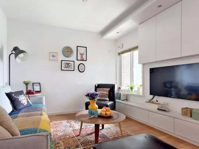 客廳是布藝沙發(fā),顏色裝飾比較鮮艷。與白色墻面碰撞,更顯活力跳躍。