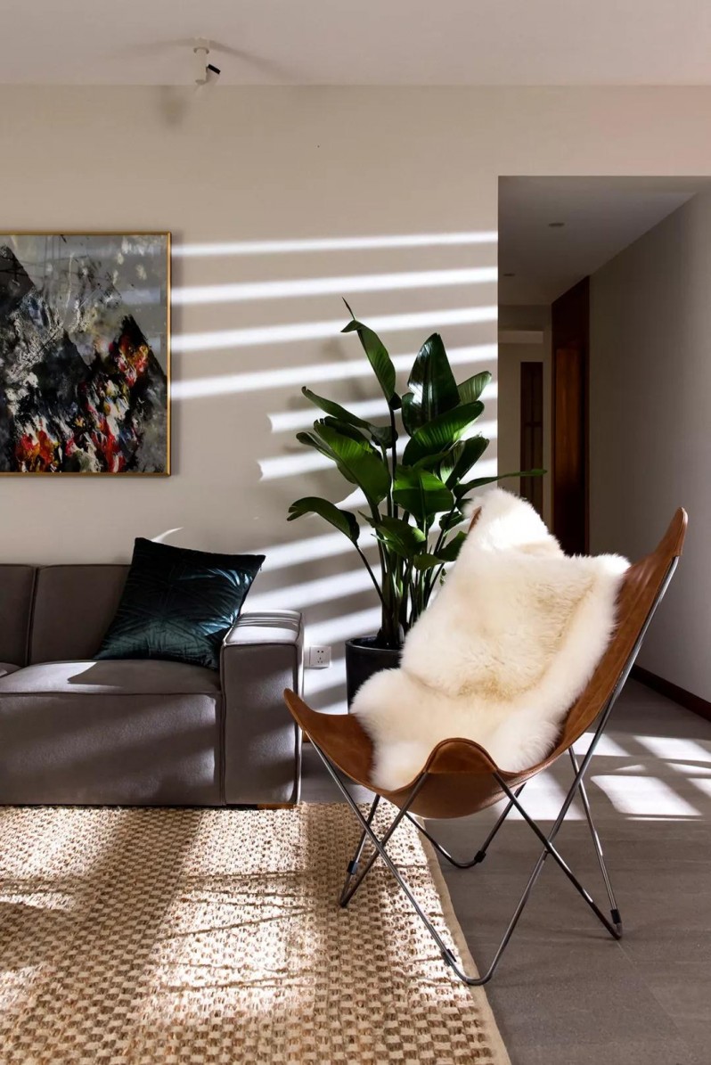 在灰白的世界里,劍麻編織地毯與黑色茶幾的加入,自然中透露一絲理性。從餐廳百葉窗透來的縷縷陽光,隨光陰變化,讓空間生動有趣,仿佛浸在林中樹屋,悠閑自在。