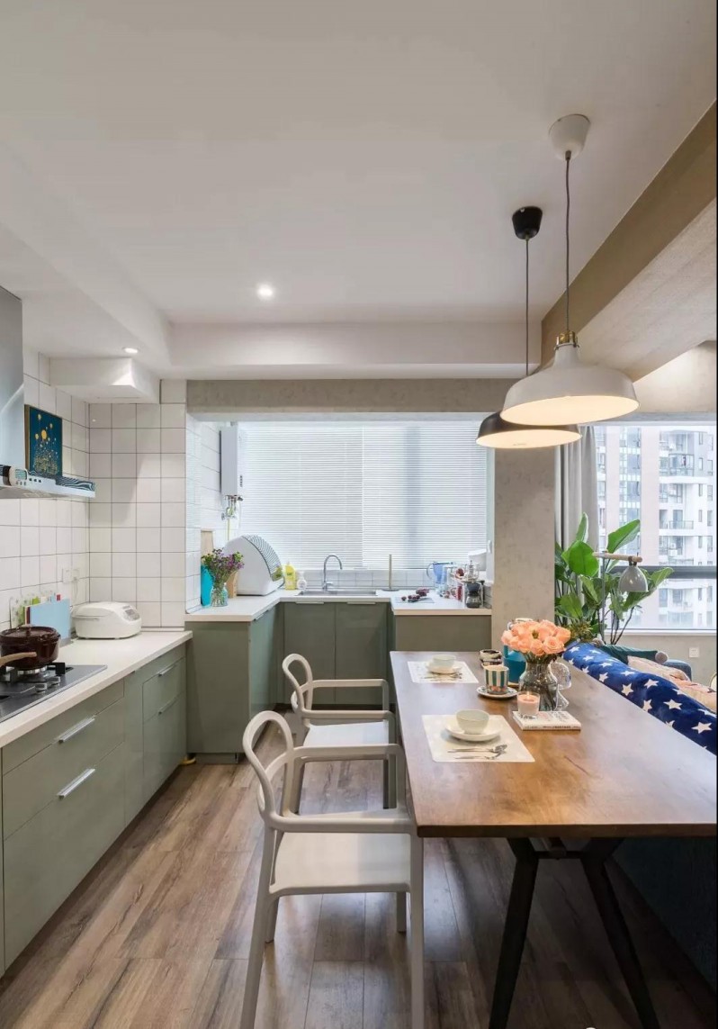 木地板+白色櫥柜+白墻,結(jié)合開放式設(shè)計,寬敞通透。
