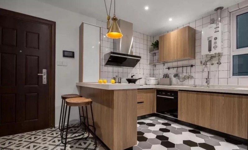 黑白六角磚搭配木色櫥柜,冷暖搭配更和諧。