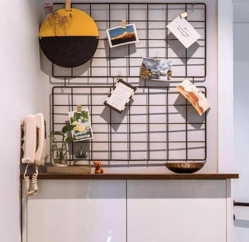 入戶靠墻擺放白色玄關柜,滿足放鞋需求;鞋柜上方用網格架布置成照片墻,溫馨實用。