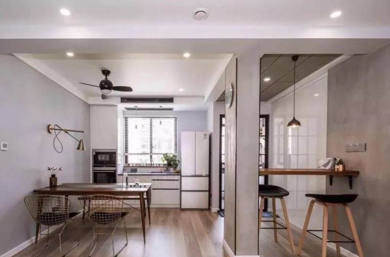 廚房進行了大改造,將原本的廚房空間砍半,并入到餐廳中。但因為餐廚間有跟承重柱不能敲掉,只好刷上水泥漆、包上防護條,隔出一個吧臺。