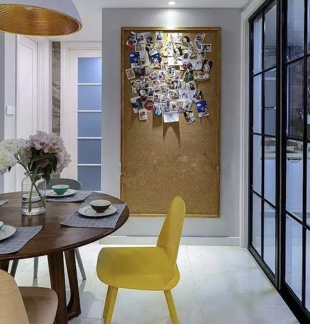 幾把時(shí)尚輕盈的餐椅,自然大方,還能為餐廳增添不少亮色,餐廳背景墻貼滿了一家人嬉笑怒罵的各種搞怪照片,充滿了人情味和生活氣息。