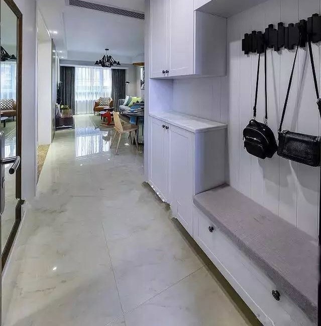 玄關(guān)比較長,所以玄關(guān)柜延伸的也很長,開放式區(qū)域既是掛包包圍巾和換鞋的場所,封閉式柜子用來收納過季的鞋子,雨傘等,收納效果特別棒,清一色的白色中,偶爾點(diǎn)綴淺灰色和黑色,簡約耐看。