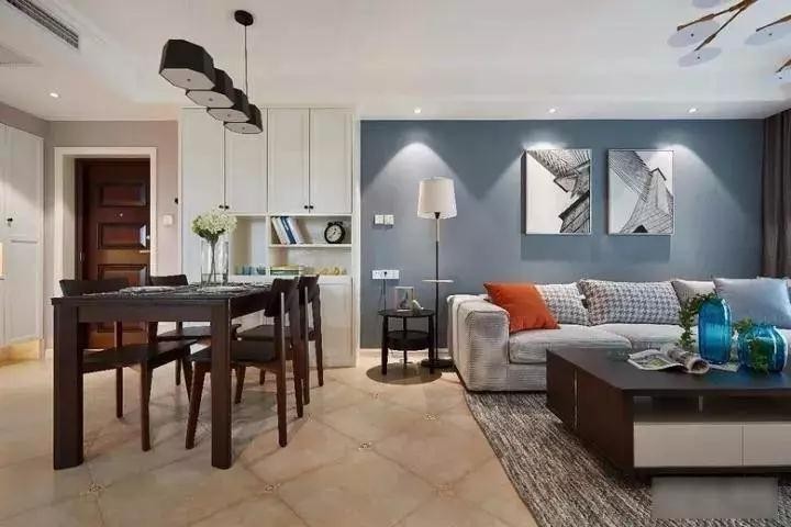 客廳背景墻是宜家風(fēng)最受捧的灰藍(lán)色調(diào),搭配繪有年輪圖案的米色布藝沙發(fā),輕松愉悅又非常的溫馨,給人以家的感覺,茶幾選擇了與餐桌一致的深咖色,在綠植和藍(lán)色玻璃瓶的襯托下,讓整個(gè)客廳雅致清透不少。