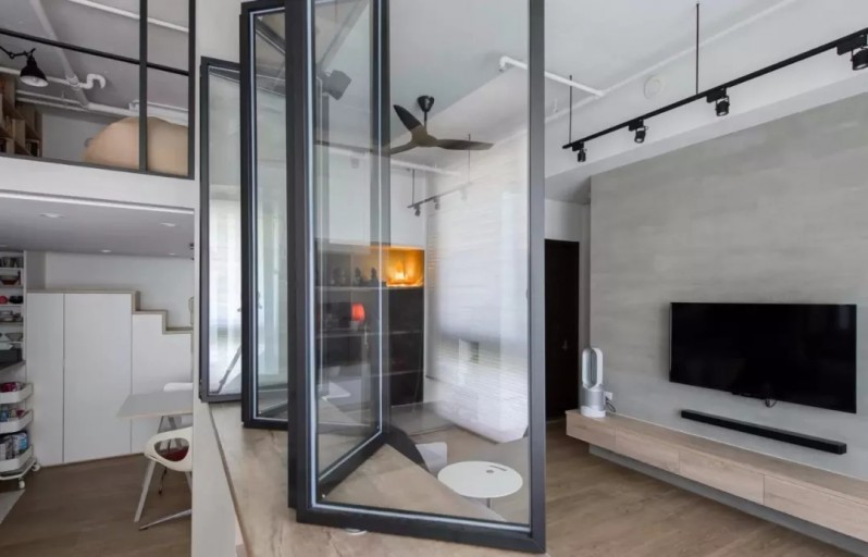 設(shè)計師讓餐廳、客廳、工作區(qū)以及二層的書房之間都采用玻璃門窗隔斷,以此來保證室內(nèi)光線的充足,設(shè)計思路非常新穎,尤其是可折疊的窗戶,得到戶主家人們的一致稱贊。門口的鞋柜設(shè)計得也非常巧妙,節(jié)省了空間。