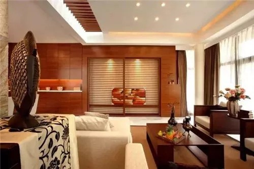 這款現(xiàn)代中式客廳裝修中,整體采用了簡單線條+棕色實(shí)木材質(zhì)來裝飾,沒有采用過多的裝飾,只以光滑的平面為處理。在昏黃的燈光下,更有著暖意之中的寧靜感。