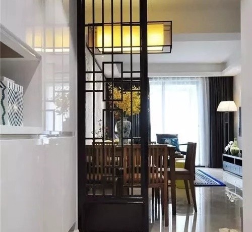 玄關(guān)采用了中式鏤空隔斷來打造,以免影響了風(fēng)水。體現(xiàn)清晰的中式立意,表達(dá)美學(xué)中影影綽綽的意境。底部全木板的設(shè)計(jì),可加固花格的強(qiáng)度,防小孩踢,防玩具車撞擊,也擋住冬天里穿堂的腳底涼風(fēng)。