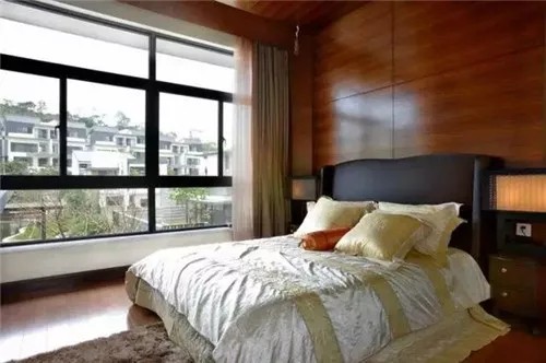 臥室墻面以窗而設(shè),達(dá)到了很好的視覺效果。墻上以黑白黃+豎條狀的壁紙來裝飾,帶來了簡潔硬朗的質(zhì)感。家居以深棕色的實(shí)木材質(zhì)來裝飾,整面墻以櫥柜的設(shè)計(jì),很好的展現(xiàn)了設(shè)計(jì)感與實(shí)用性并存的局面。床上絲綢質(zhì)的床品,與整體簡潔中又展現(xiàn)了大氣。