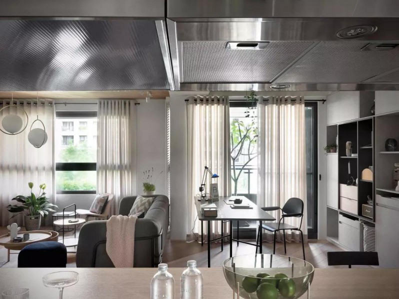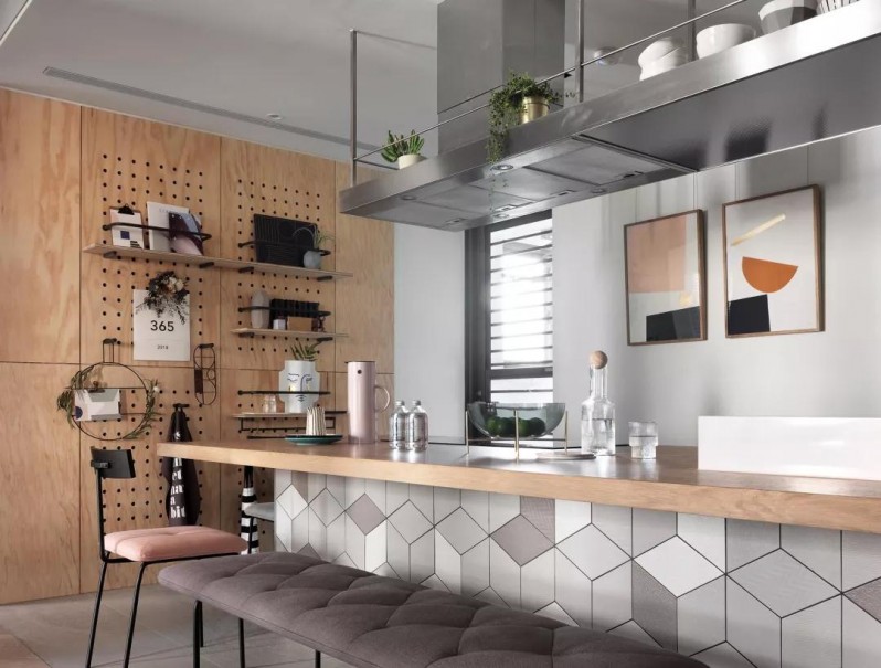 吧臺(tái)就是餐桌了,對(duì)于家里的兩個(gè)人來(lái)說(shuō),完全足夠了,并肩坐也是非常舒服的,讓兩個(gè)人的關(guān)系更加貼近。左邊的墻面,設(shè)計(jì)木制洞洞板后,不僅起到了裝飾作用,還起到了收納作用。