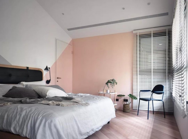 臥室的白色和粉色撞色墻面,很大氣,再加上木質(zhì)斜紋人字形鋪滿的地板,很時(shí)尚高檔。