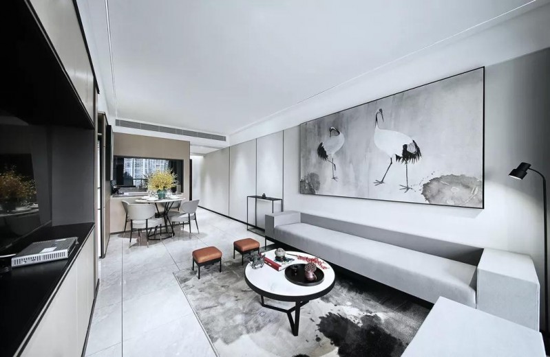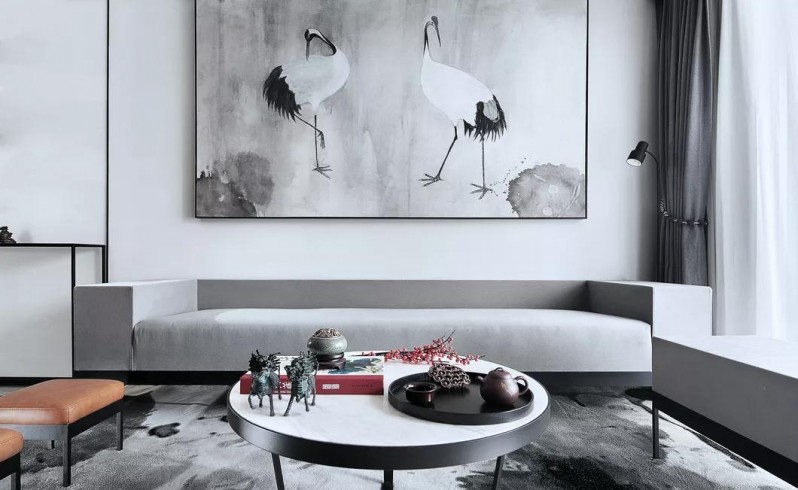 這套案例中最喜歡的就是沙發(fā)背景墻的裝飾畫,黑白灰色調(diào)的仙鶴裝飾畫,與潑墨地毯有呼應的效果,是中式元素的現(xiàn)代化。