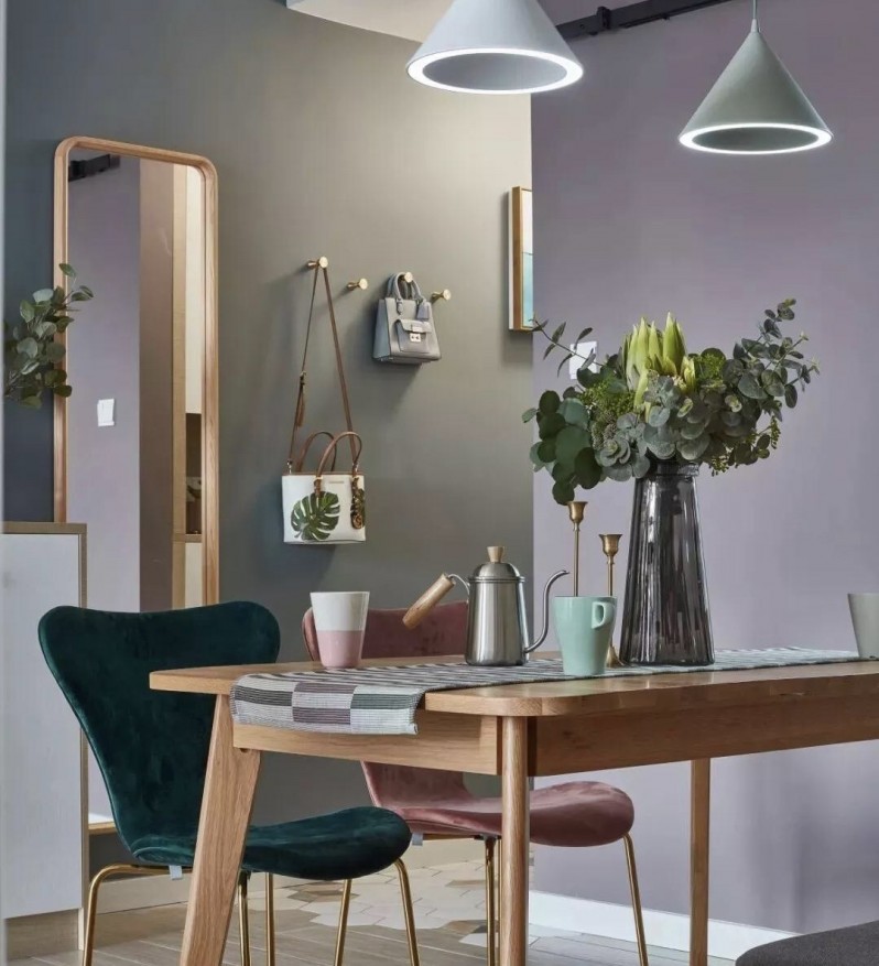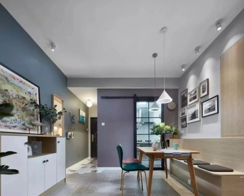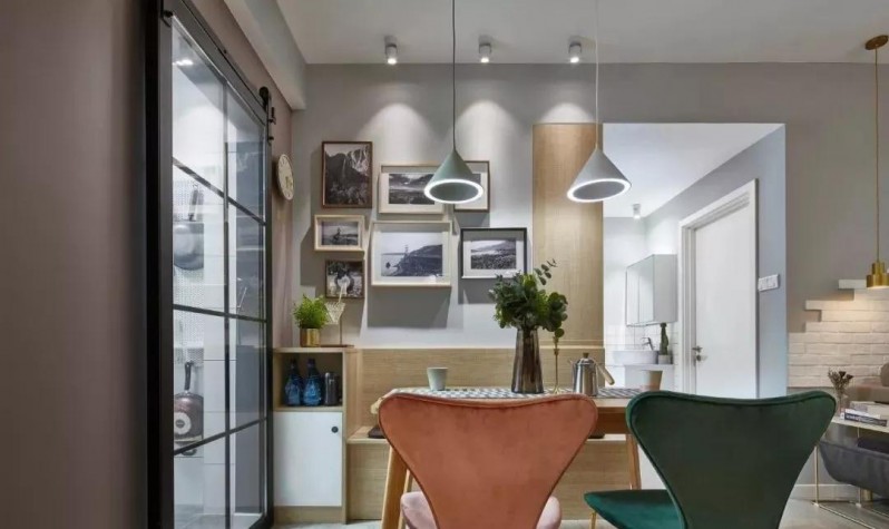 從玄關(guān)進(jìn)來便是餐廳,餐廳與廚房之間安裝了玻璃谷倉門,節(jié)省空間也增加了餐廳的自然。入戶墻面的灰綠色與餐廳墻面的暖木棕,設(shè)計中色彩的撞色,更可以讓空間層次有了生動之美。