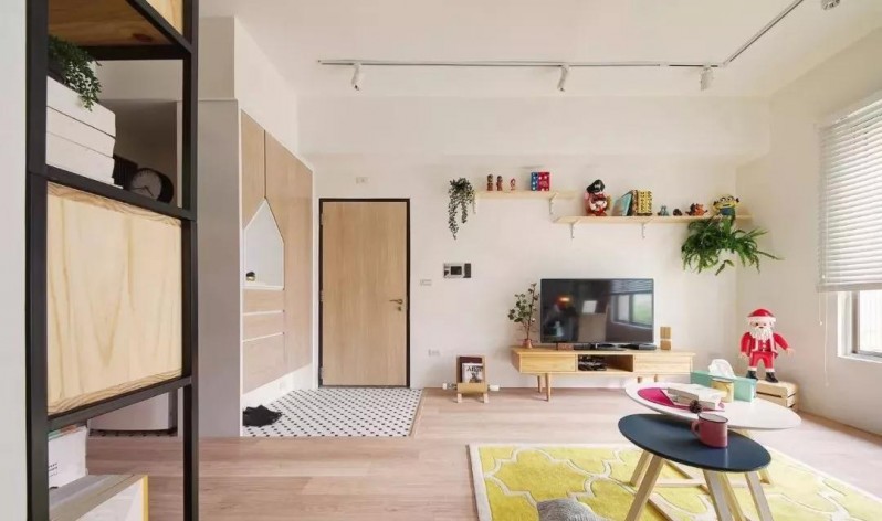 入門右側(cè)打造了入墻式收納柜,中間留空層做了個小房子的造型,便于進門放置隨手小物品,美觀又實用?;宜{色的沙發(fā)、明黃色的地毯、玫紅色茶幾、還有各種顏色鮮艷的小物件點綴著空間,繽紛多彩,卻不雜亂,看著讓人心情也格外的明媚。