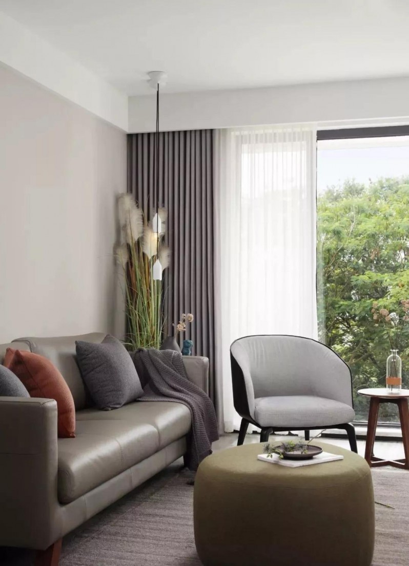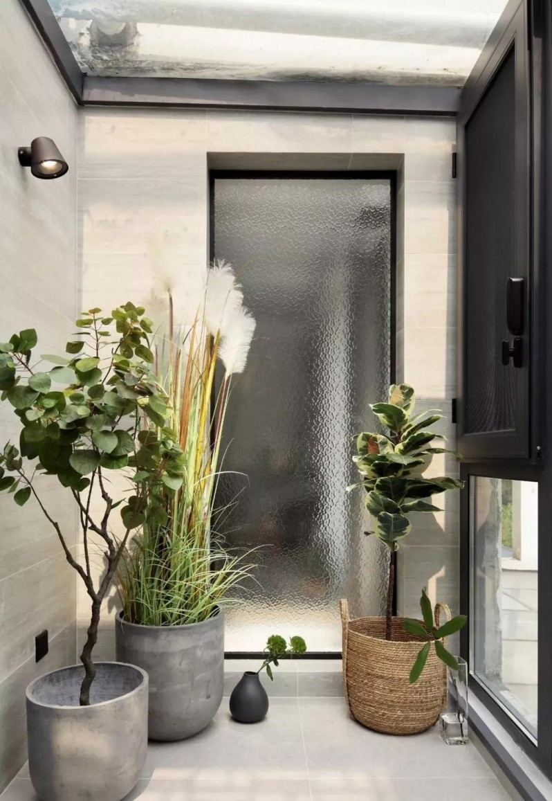 改造成陽光房的陽臺,與客廳只用玻璃相隔,一內(nèi)一外之景。因為水波紋立體凹凸的質(zhì)感和光影的透射,視覺感受顯得清雅宜人。